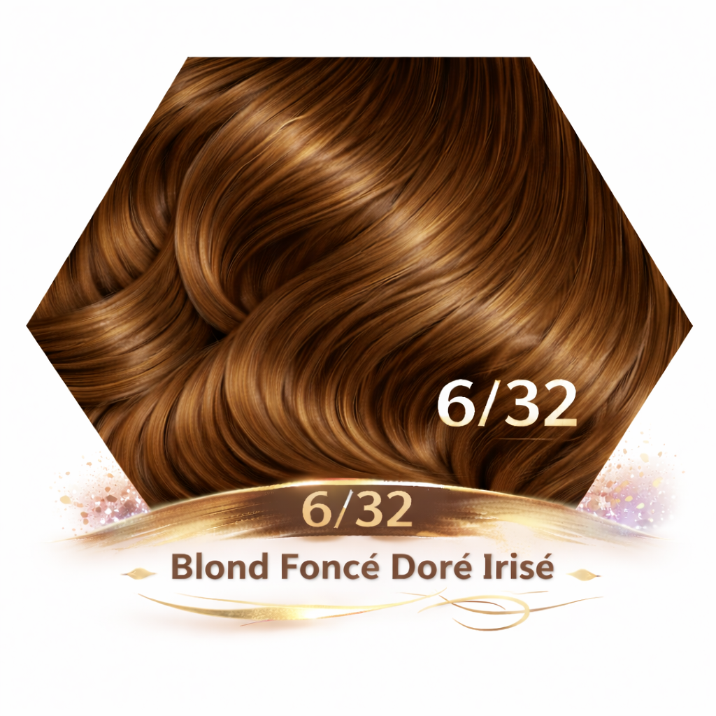 Coloration cheveux blond foncé doré irisé 6/32