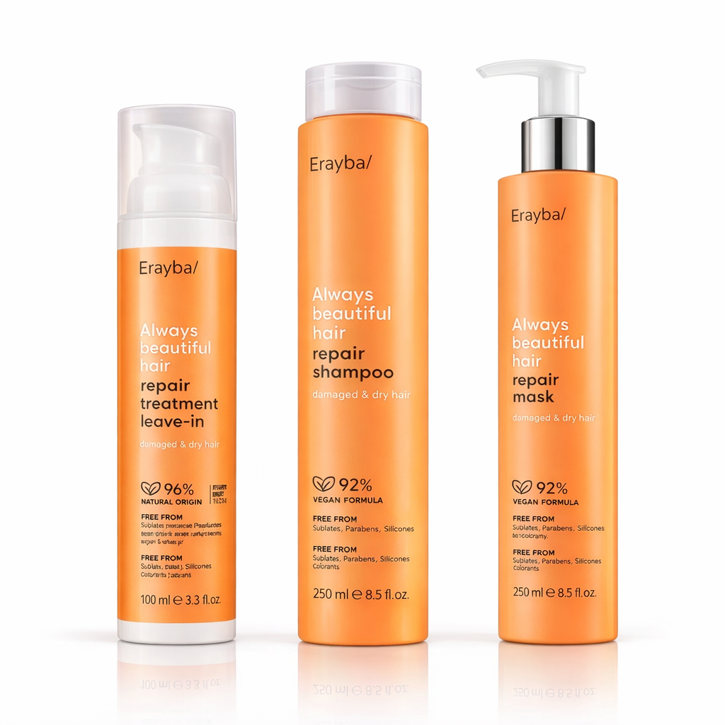 Le Coffret Repair Erayba est la routine complète conçue pour réparer, nourrir et revitaliser les cheveux abîmés, secs ou fragilisés. Grâce à ses actifs puissants – argan, acide hyaluronique, amande douce et karité – il restaure la fibre en profondeur et redonne immédiatement douceur, force et brillance.